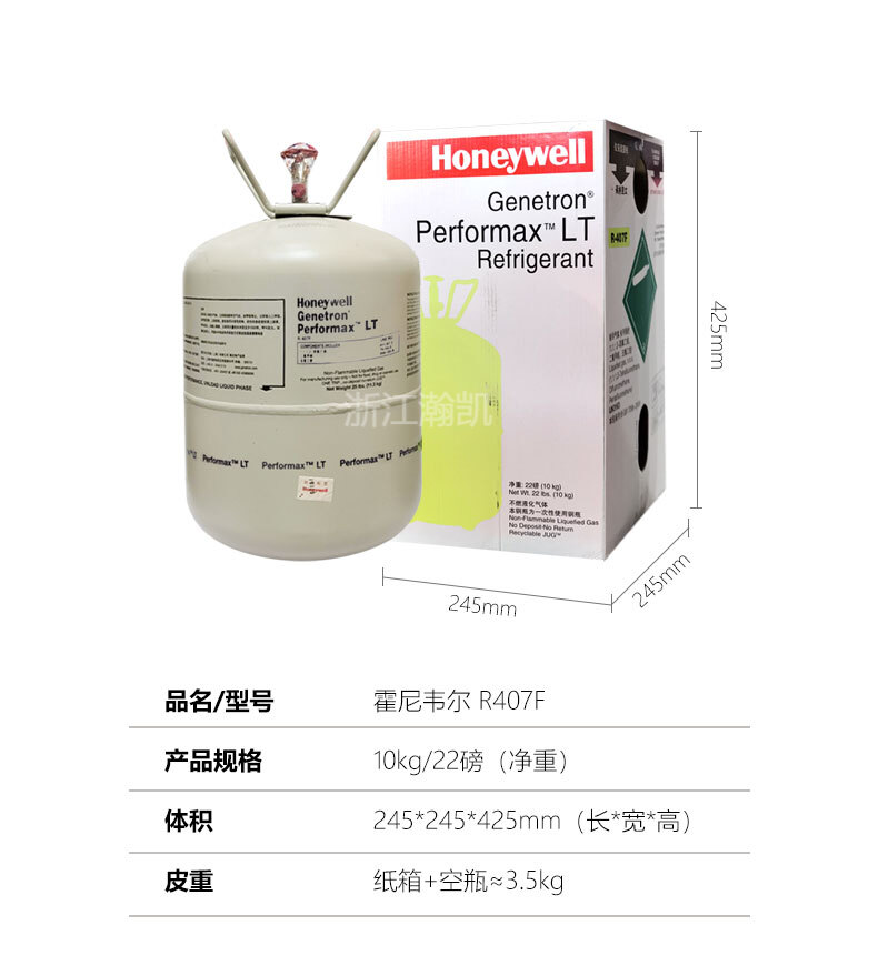 霍尼韋爾R407F制冷劑,商品名稱有 Genetron Performax® LT 制冷劑、R407F等,R407F屬于HFC型非共沸環保制冷劑(完全不含破壞臭氧層的CFC、HCFC),廣泛用于新冷凍設備上的初裝和維修過程中的再添加。