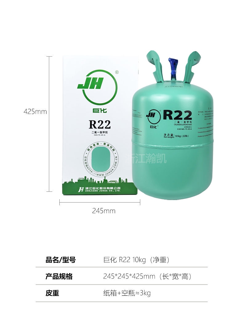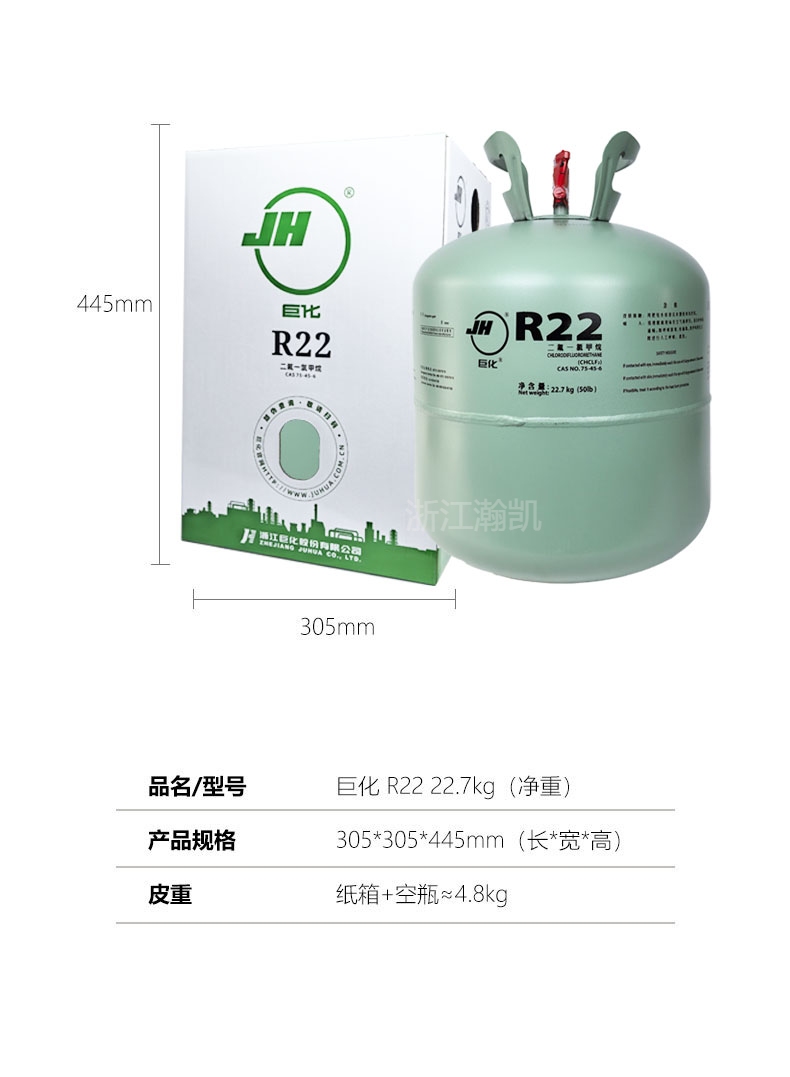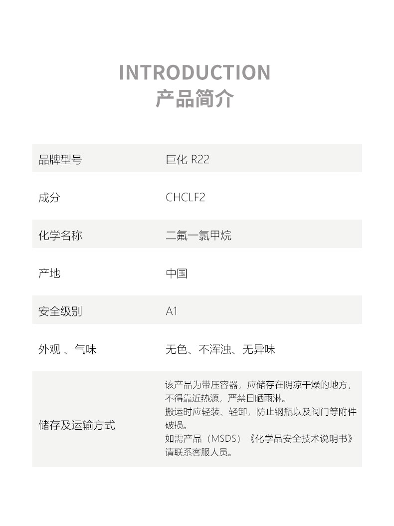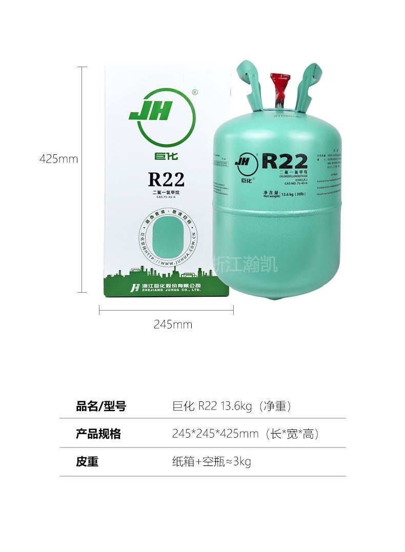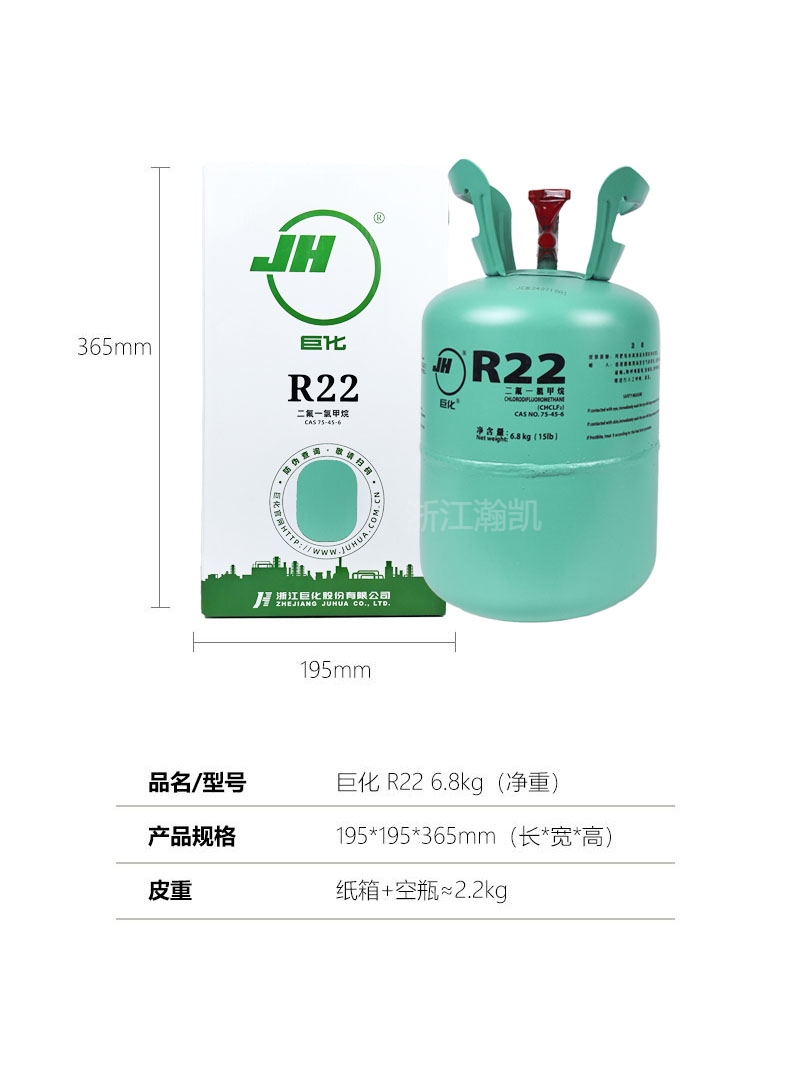 巨化R-22制冷劑,別名R22、氟利昂22、F-22、HCFC-22、二氟一氯甲烷,商品名稱有Freon 22、Genetron 22等,中文名稱二氟一氯甲烷,英文名稱Chlorodifuoromethane,化學(xué)式CHClF2。由于R-22屬于HCFC類物質(zhì)(第二批受限的ODS物質(zhì)Class II Ozone-depleting Substances)——對臭氧層有破壞、并且存在溫室效應(yīng),因此在發(fā)達國家(歐盟、日本、美國),已經(jīng)停止了在新空調(diào)、制冷設(shè)備上的初裝;中國目前對于R22制冷劑的生產(chǎn)、初裝、以及再添加基本沒有限制。